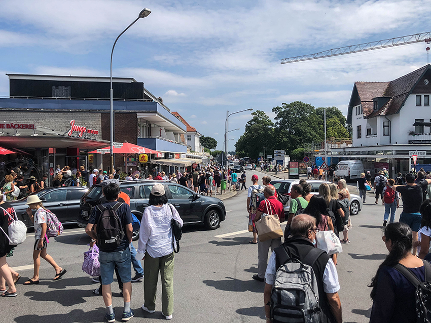 خلال عطلت نهاية الأسبوع قررت أن استثمر في تذكرة الـ 9 يورو. الجو كان مناسباً للسباحة فذهبت مع صديقة تونسية من هامبورغ إلى لوبيك. استغرقت الرحلة حوالى ساعة و20 د حتي وصلنا إلى محطة Lübeck-Travemüde Strand. يغادر القطار RE8 كل ساعة من محطة هامبورغ المركزية. كنا محظوظتين أننا استطعنا الجلوس خلال الطريق ذهاباً وعودة. القطار كان مزدحماً، حتى ممرات العربات كانت ممتلئة بالركاب! شعرنا للحظة أن القطار تحول إلى طائرة من كثرة اللغات الأجنبية التي سمعناها ذلك اليوم.