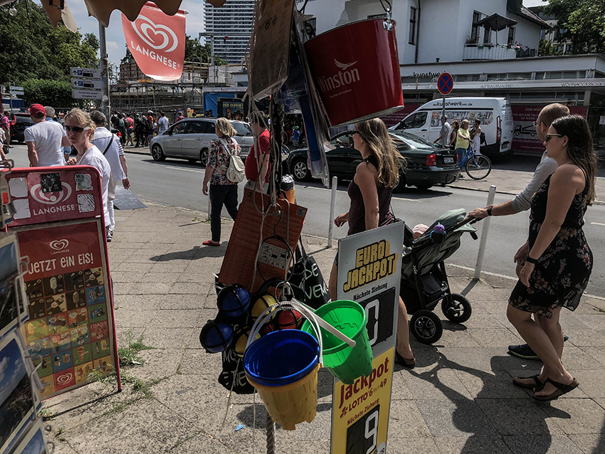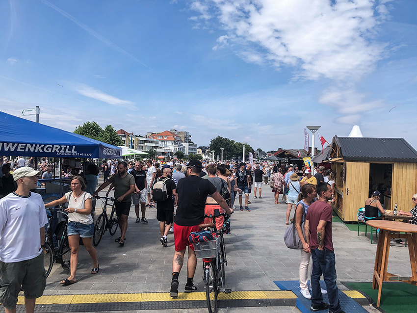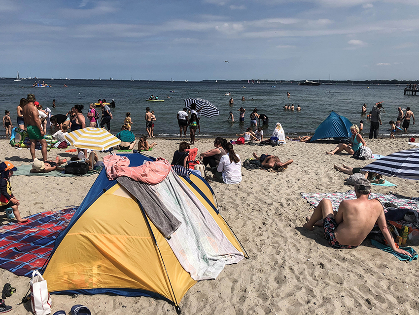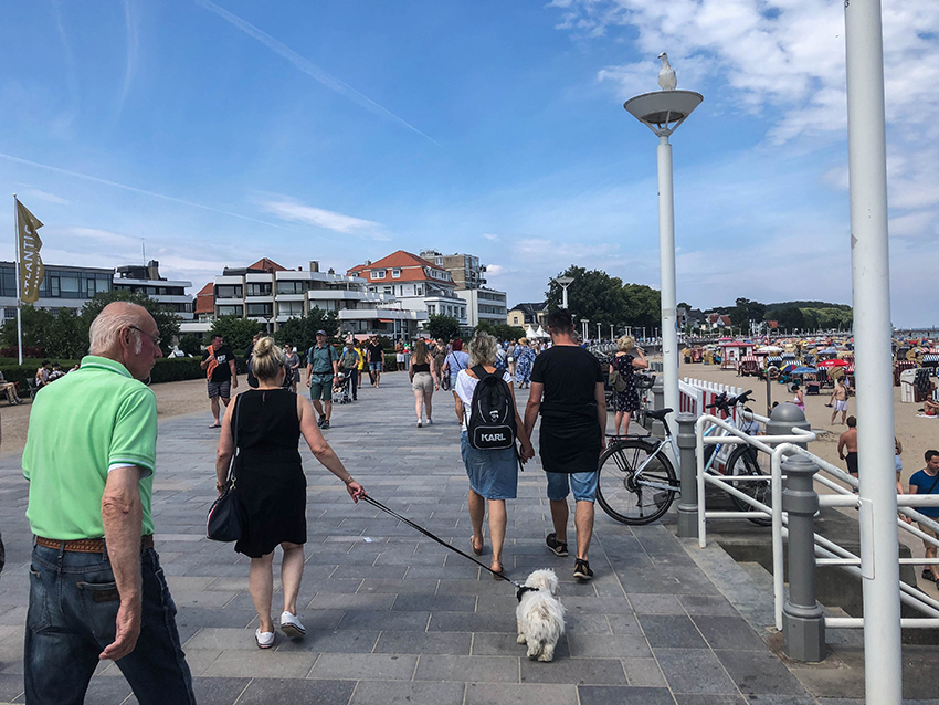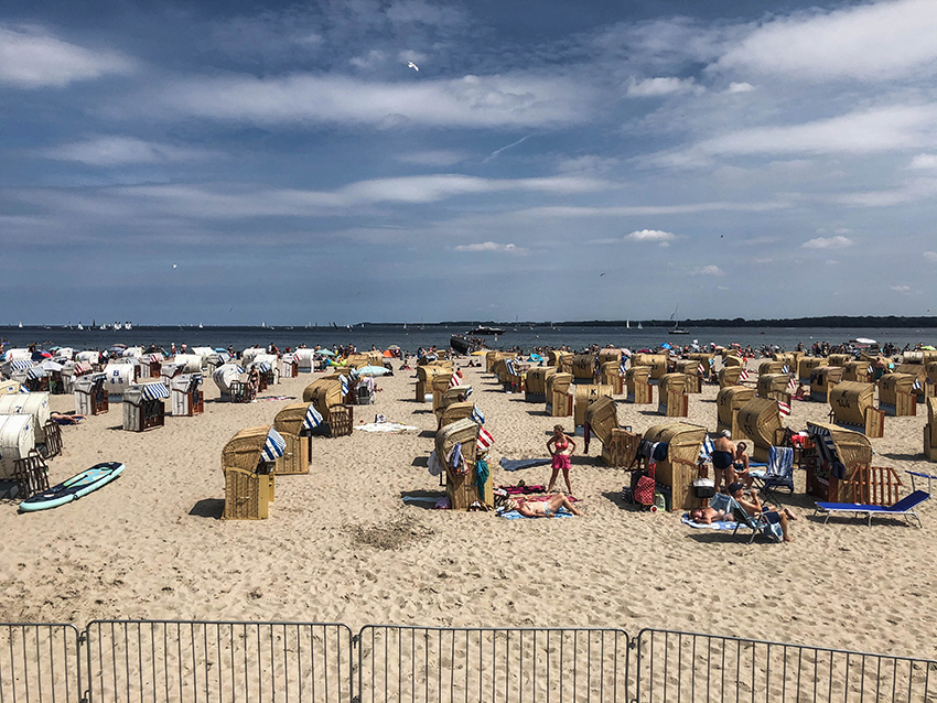 لم نكن بحاجة إلى السؤال عن مكان الشاطئ. فمنذ أن خرجنا من المحطة والجميع يسير في نفس الاتجاه بشكل مستقيم نحو الشاطئ، فتبعنا الجميع. كانت الشوارع ممتلئة بالمصطافين. المحلات الصغيرة على الجانبين كانت تحاول جذب السياح لشراء المشروبات الباردة أو ألعاب البحر للأطفال. ١٠ دقائق ووجدنا أنفسنا أمام بحر البلطيق. على مرمى البصر يميناً ويساراً كان الشاطئ ممتلئ. كبائن بألوان زاهية صفراء وزرقاء امتدت على طول الشاطئ والتي يمكن للزوار تأجيرها خلال اليوم. كل عدة أمتار على طول الكورنيش كانت هناك سلالم للنزول إلى الشاطئ وعلى مدخلها أكشاك صغيرة يمكن منها شراء شمسية للبحر بـ 20 يورو.